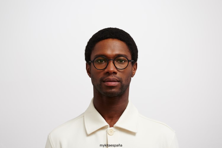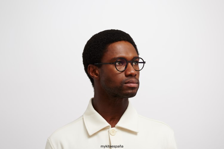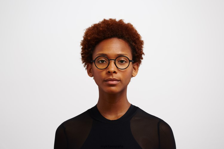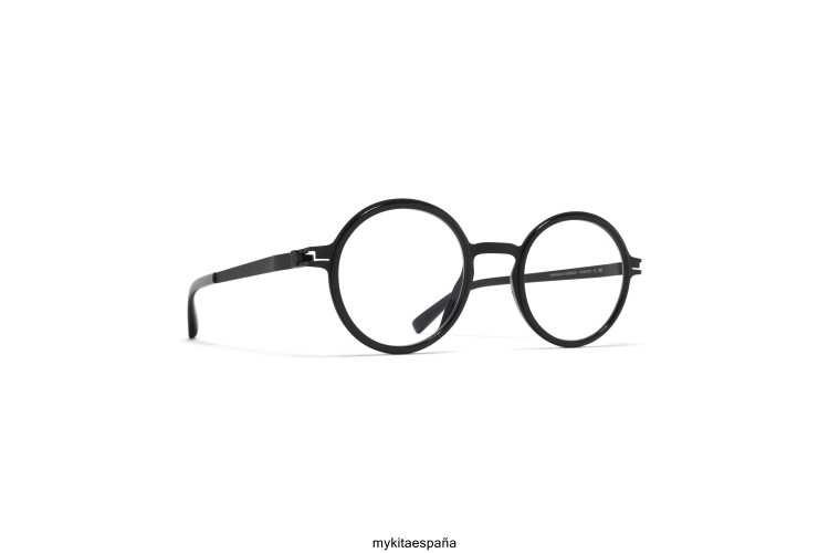 fabricado en acero inoxidable ligero, dayo en negro/negro con lentes transparentes es un marco óptico de forma redonda de la colección de anillos de acetato de mykita. hecho a mano en berlín.