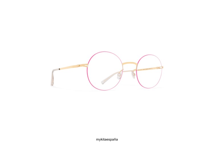 fabricada en acero inoxidable ultraligero, kayo en oro/rosa neón con lentes transparentes es una montura de forma redonda de la colección mykita lessrim. Con solo 0,5 milímetros de ancho, el borde de acero inoxidable se encuentra al ras en la ranura del perímetro de la lente. hecho a mano en berlín.