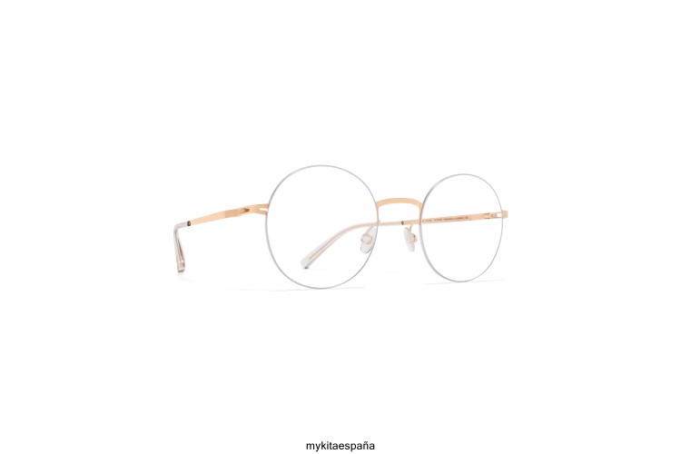 fabricada en acero inoxidable ultraligero, kayo en plata/oro champán con lentes transparentes es una montura de forma redonda de la colección mykita lessrim. Con solo 0,5 milímetros de ancho, el borde de acero inoxidable se encuentra al ras en la ranura del perímetro de la lente. hecho a mano en berlín.