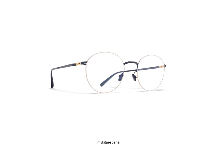 Hecho de acero inoxidable ultraligero, tomomi en oro/índigo con lentes transparentes es un marco óptico en forma de panto de la colección mykita lessrim. Con solo 0,5 milímetros de ancho, el borde de acero inoxidable se encuentra al ras en la ranura del perímetro de la lente. hecho a mano en berlín.
