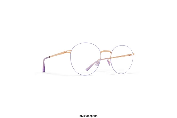 fabricada en acero inoxidable ultraligero, tomomi en champagne gold/iris lilac con lentes transparentes es una montura óptica en forma de panto de la colección mykita lessrim. Con solo 0,5 milímetros de ancho, el borde de acero inoxidable se encuentra al ras en la ranura del perímetro de la lente. hecho a mano en berlín.