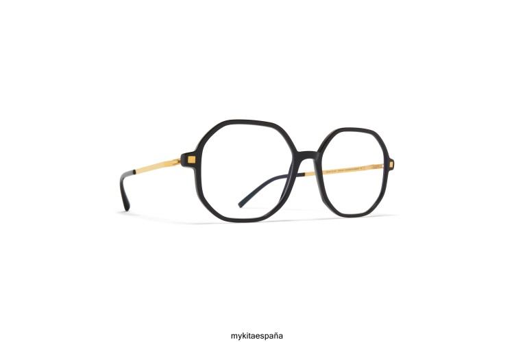 hecho de acero inoxidable liviano y acetato delgado, hilla en negro c6/oro brillante con lentes transparentes es un marco óptico de forma redonda de la colección de acetato mykita lite. hecho a mano en Berlín.