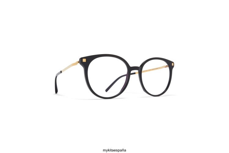 Hecho de acero inoxidable liviano y acetato delgado, julla en negro c6/oro brillante con lentes transparentes es un marco óptico en forma de panto de la colección de acetato mykita lite. hecho a mano en Berlín.
