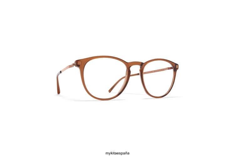 Hecho de acero inoxidable liviano y acetato delgado, nukka en topacio c73/cobre brillante con lentes transparentes es un marco óptico en forma de panto de la colección de acetato mykita lite. hecho a mano en Berlín.