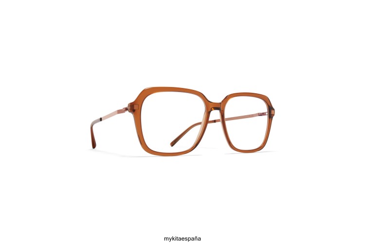 Hecho de acero inoxidable liviano y acetato delgado, amka en topacio c73/cobre brillante con lentes transparentes es un marco óptico de forma cuadrada de la colección de acetato mykita lite. hecho a mano en Berlín.